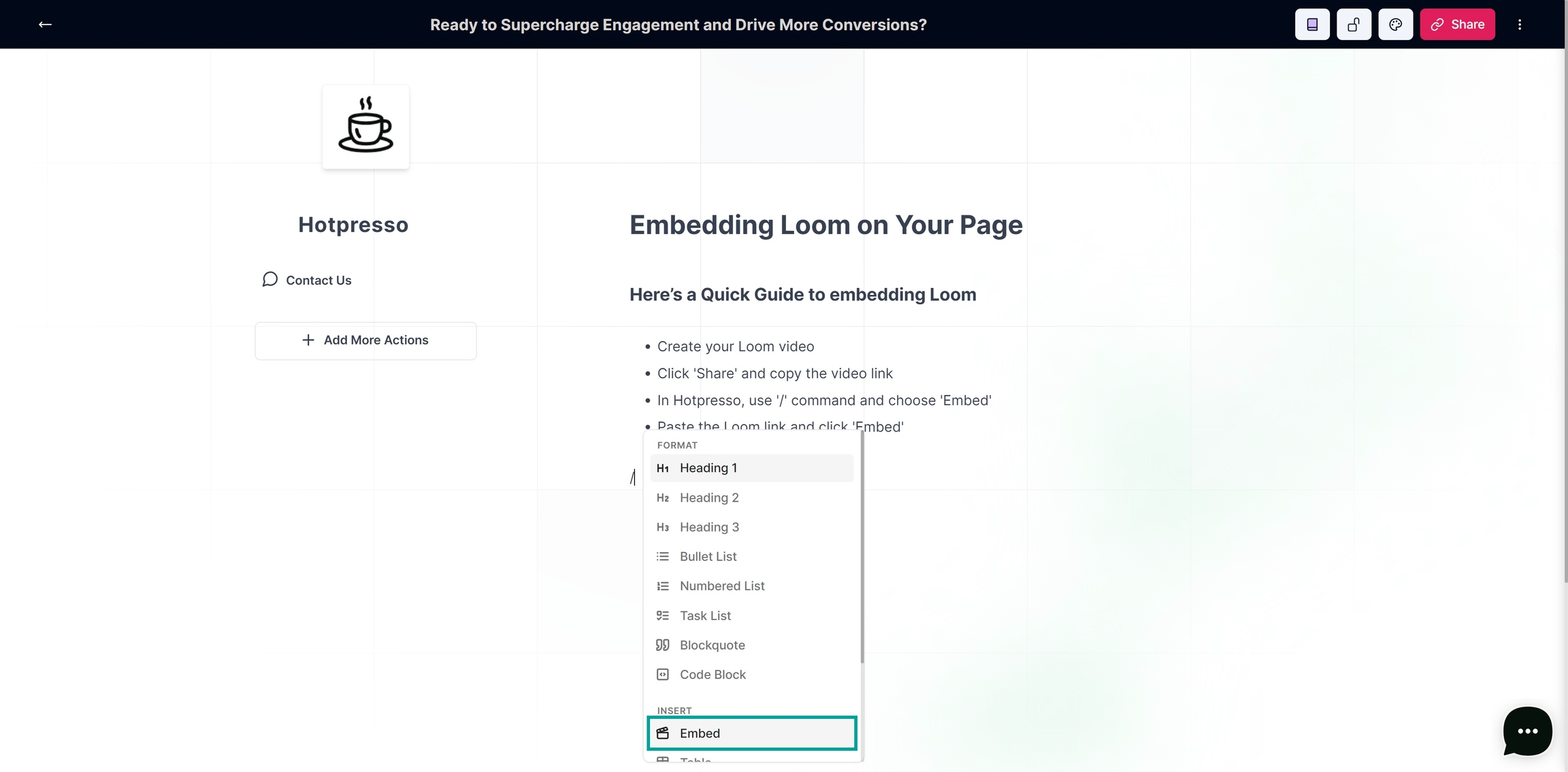 Learn how to easily embed Loom videos in Hotpresso pages. Enhance your B2B outreach with engaging visual content, step-by-step guide included. Captivate prospects now!